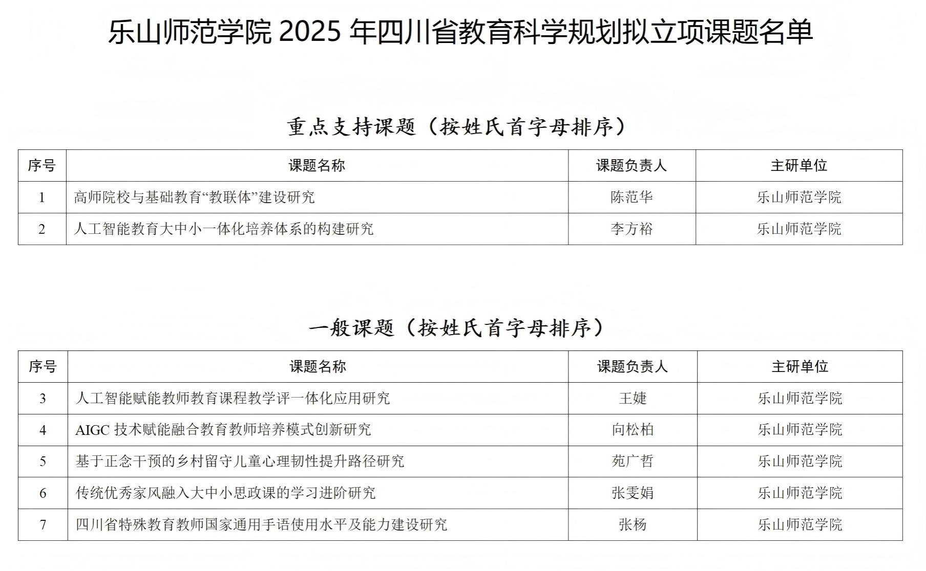 本网讯(文、图/章含颖)近日,2025年度四川省教育科学规划课题立项名单由省教育科学规划领导小组办公室正式公布。我校在此次申报工作中表现突出,共有7项课题成功立项,涵盖重点支持课题与一般课题等多个类别。