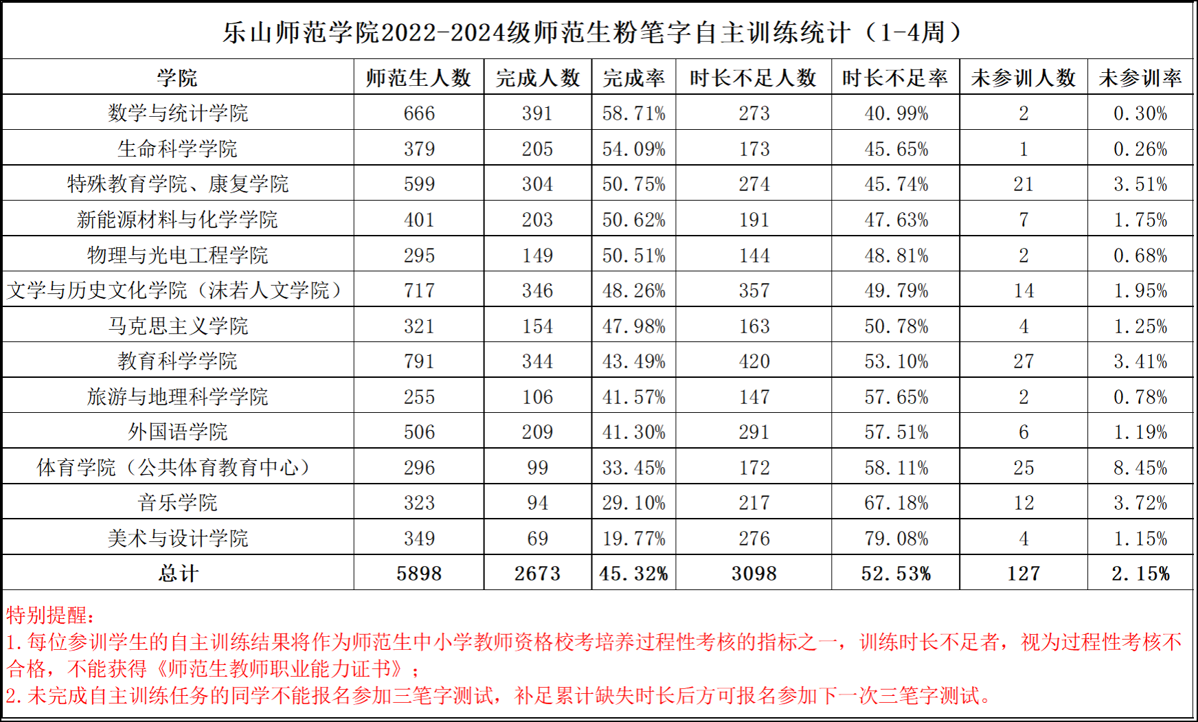关于乐山师范学院师范生2025-2026学年第1学期1-4周粉笔字自主训练结果的通报