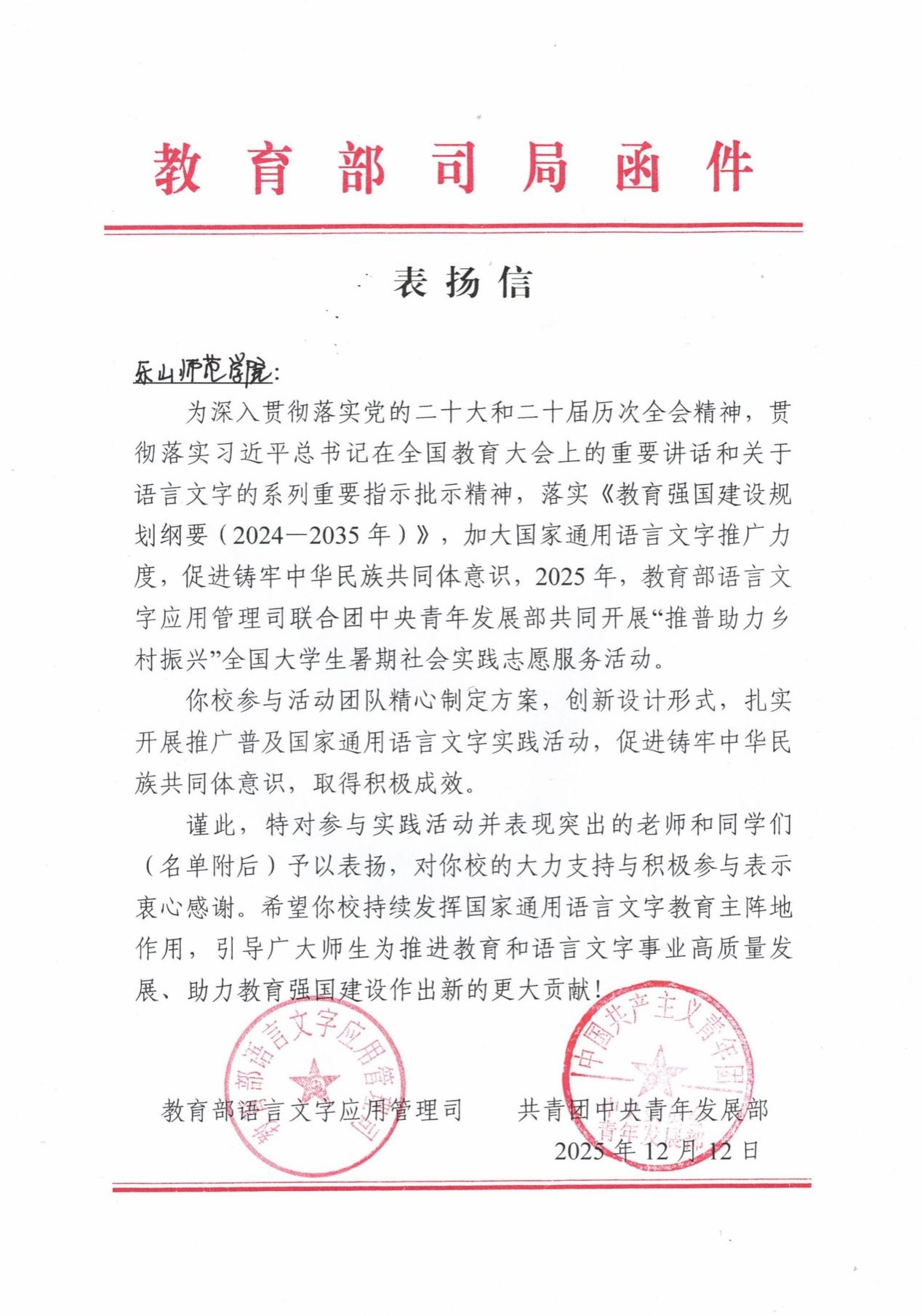 近日,学校“格桑语桥・手语同心”志愿服务队获教育部、共青团中央联合表彰,获评2025年“推普助力乡村振兴”全国优秀团队。团队依托特殊教育学科优势,8月赴甘孜泸定县特殊教育学校开展为期1周的推普实践,将红色文化、藏族非遗融入手语教学,开展30余场课程,讲授500余个核心词汇,践行“以语言促融合”理念。